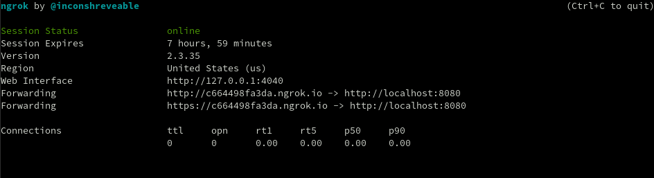 After running ngrok, you will be able to retrieve your NGROK_URL which you can use in conjunction with the API_KEY in order to set the Webhook. The screenshot below shows what the ngrok application looks like when it is initially started: