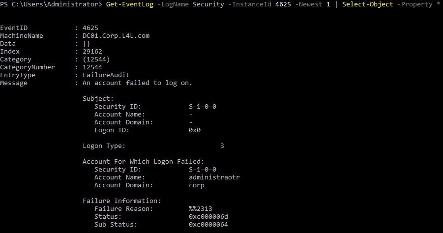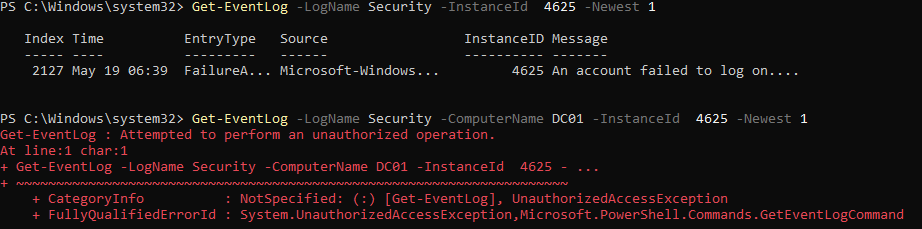 Get-EventLog -LogName Security -ComputerName DC01 -InstanceId 4625 -Newest 1
