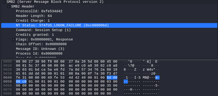 As stated before, I attempted to authenticate initially using wmiexec. While authenticating, I ran Wireshark (a network protocol analyzer) and found that the network traffic included the Status code, but I wanted to see if the Sub Status code was returned at any point. Diving into the NT Status: STATUS_LOGON_FAILURE (0xc000006d) error produced the following: