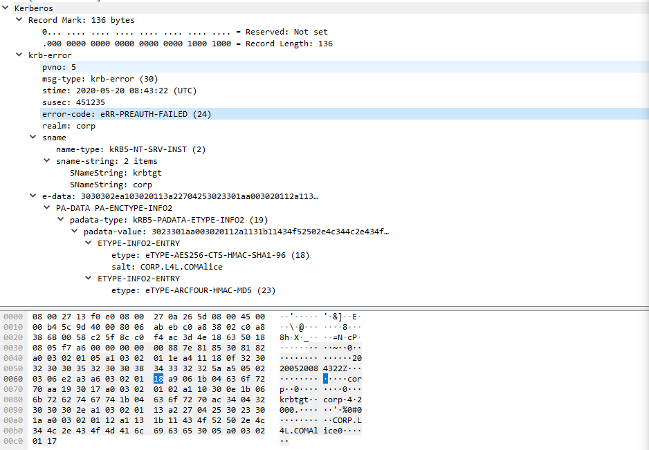The Kerberos documentation for eRR-PREAUTH-FAILED (24) only provided us with the generic version “Pre-authentication information was invalid” as alluded to by the Microsoft codes. As with the Linux instance, the Sub Status code was not returned at any point. If you would like to dig deeper into the Wireshark output generated by Kerberos, Kerberos Wireshark Capture: A Windows Login Example provides a great breakdown of the network traffic captured during user authentication.