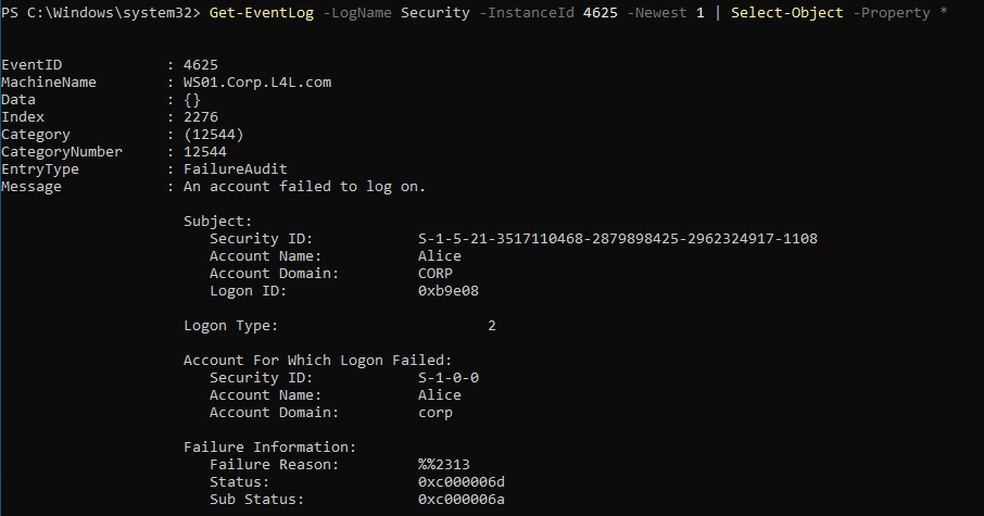 Get-EventLog -LogName Security -InstanceId 4625 -Newest 1 | Select-Object -Property *