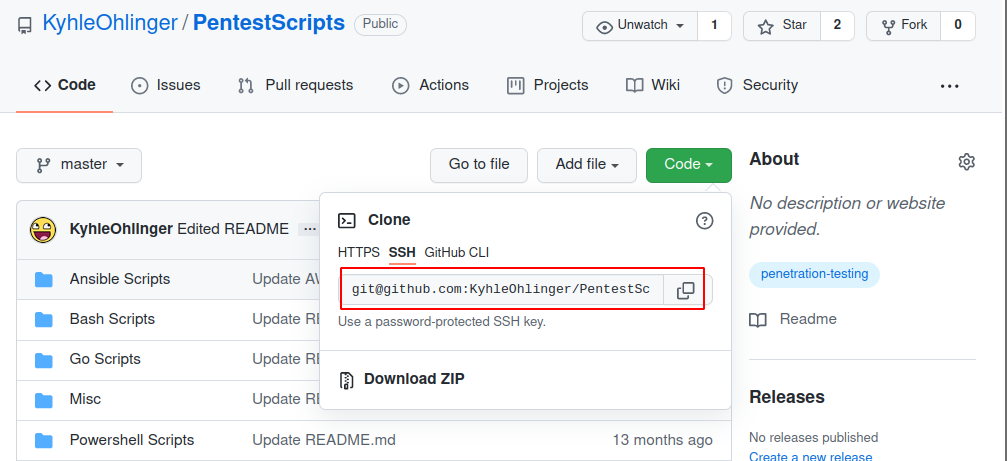 Now that the SSH keys are created, you can start cloning your repositories into the specified directory. In order to accomplish this, simply navigate to the repository using the GitHub web application and copy the SSH cloning command: