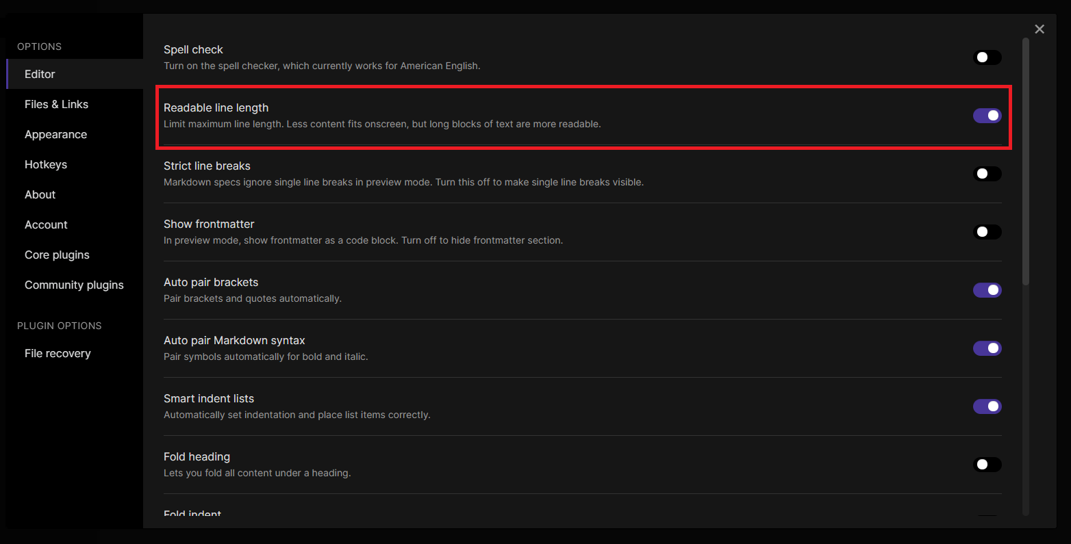 While I do enjoy Obsidian thus far, I have come across a few points which have annoyed me. The first of which was that Obsidian can only ingest markdown files, and since I used CherryTree for years, it took me a substantial amount of time to convert all of my files to markdown. The second issue that had was the default layout, however that was a quick fix by navigating to the settings menu and changing the Readable line length option as shown below: