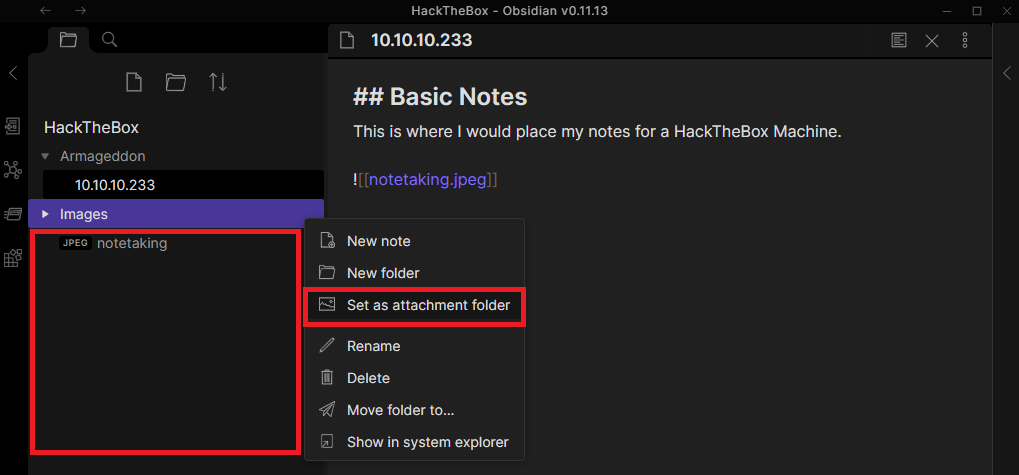 In order to circumvent this issue – I had more than a hundred images so the layout of the navigation pane looked terrible – I created an Images folder and used the Set as attachment folder setting to ensure that all future attachments would automatically be placed within that directory.